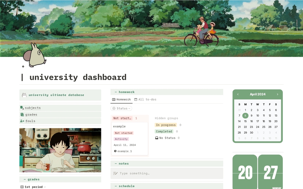 A Notion template inspired by the enchanting world of Studio Ghibli. This ultimate academic companion combines essential tools like a grades average calculator and a foul system. Manage your schedule, track homework, organize subjects, and store notes—all within a magical interface that infuses your academic journey with whimsy and wonder. Dive into your studies with the charm of Ghibli guiding your way.
